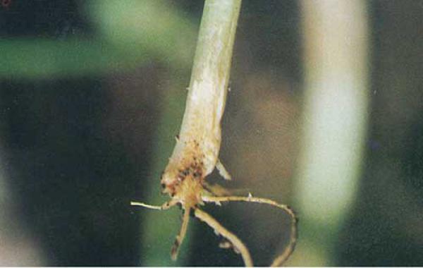 (1)幼苗期。最初呈水浸狀,后于莖基或根部產(chǎn)生褐斑,逐漸擴大后凹陷,嚴重時病斑繞莖基部或根部一周,致地上部逐漸枯萎??v剖莖基或根部,導管變?yōu)樯詈稚?,后根莖腐爛,不長新根,植株枯萎而死。