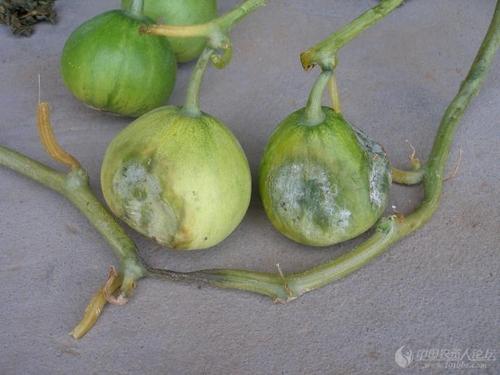 根莖部染病,初始產(chǎn)生暗綠色水漬狀病斑,病斑迅速擴(kuò)展、莖呈軟腐狀,有時(shí)長達(dá)10厘米以上,植株萎蔫、青枯而死亡,但維管束不變色。幼苗染病,多始于嫩尖,產(chǎn)生水漬狀病斑,病情發(fā)展較快,萎蔫枯死,但不倒伏。葉片染病,初始產(chǎn)生暗綠色水浸狀斑點(diǎn),擴(kuò)展為近圓型或不規(guī)則大型的黃褐色病斑;天氣潮濕時(shí)全葉腐爛,并產(chǎn)生白色霉層;干燥時(shí)病斑極易破裂。莖染病,多在近地面莖基部開始,初始呈暗綠色水漬狀斑病部縊縮,成株期往往有幾處節(jié)受害,俗稱“節(jié)節(jié)爛”。南瓜果實(shí)染病,初始出現(xiàn)水漬狀淺褐色小斑,潮濕時(shí)病斑凹陷,并長出一層稀疏的白色霉?fàn)钗铮床【逆吣夜:玩咦幽遥?,以后軟化腐爛,迅速向各方向擴(kuò)展,在病部產(chǎn)生白色霉層,最終導(dǎo)致病瓜局部或全部腐爛。發(fā)生特點(diǎn)此病由真菌鞭毛菌亞門甜瓜疫霉侵染引起。病菌以菌絲體、卵孢子和厚垣孢子隨病殘?bào)w在土中越冬。翌年春通過風(fēng)雨、灌溉水傳播。病菌發(fā)育的適宜溫度范圍很廣,在5——37℃之間,最適溫度為28——30℃,高濕是發(fā)病的決定性因素。雷雨過后,田間積水不能及時(shí)排出易誘發(fā)此病。多雨季節(jié)發(fā)病重,大雨過后暴晴最易發(fā)病流行。連作地、排水不良、澆水過多、施用未腐熟欄肥、通風(fēng)透光差的田塊發(fā)病較重。目前沅江市茶盤洲、泗湖山、共華等種植重點(diǎn)鄉(xiāng)鎮(zhèn)進(jìn)入了發(fā)病盛期。防治要點(diǎn)①實(shí)行非瓜類作物輪作3年以上,采用地膜覆蓋栽培,深溝高畦種植,施用充分腐熟有機(jī)欄肥。②種子處理:可用72.2%普力克水劑600倍液或64%殺毒礬可濕性粉劑800倍液浸種30分鐘后催芽。③選擇地勢高燥、排水良好的田塊,注意控制澆水次數(shù),雨后及時(shí)排水,加強(qiáng)通風(fēng)換氣,發(fā)現(xiàn)中心病株,及時(shí)拔除并銷毀。④藥劑防治:于發(fā)病初期選用50%安克可濕性粉劑2500倍液,25%阿米西達(dá)懸浮劑1000——1500倍液,或69%金雷水分散粒劑600——800倍液,或72.2%普力克水溶性液劑800倍液,或70%品潤干懸浮劑500倍液,或72%克露可濕性粉劑800倍液,或52.5%抑快凈水分散劑3000倍液,或72.2%霜霉威水劑500倍液,或47%加瑞農(nóng)可濕性粉劑800倍液,或64%殺毒礬可濕性粉劑1000倍液等噴霧,每隔7——10天1次,連續(xù)防治3——4次。